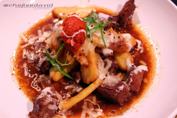 Harrissa Steak and Fries....Crispy Home Fries, Harrissa Red Wine Beef Tip Stew, Three Cheese Pepper Cheese Sauce, and Scallions