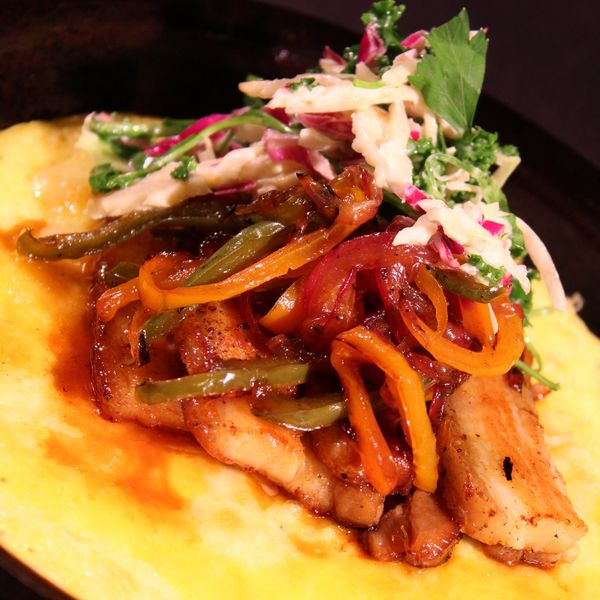 Pork Belly, Warm Pepper Relish, Spoon Bread, and Slaw