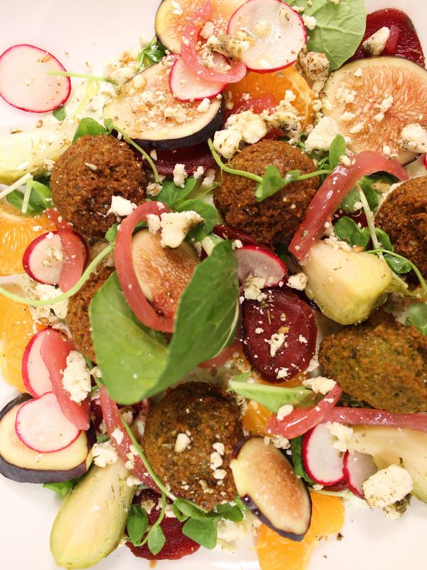 Split Pea Fritters, Figs, Mandarins, Cider Pickled Radish, Beet, Onion, Brussel, and Goat Cheese